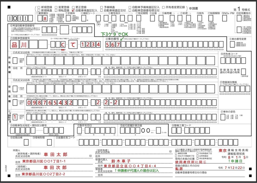 • 使用の本拠の位置が使用者の新しい住所と同じ場合は左側に「1」を記入