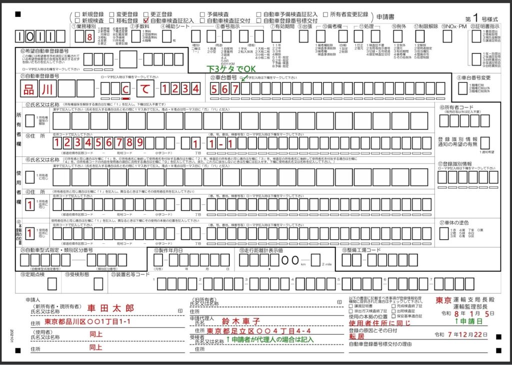 • 申請書を持っていく運輸支局名と申請日を記入