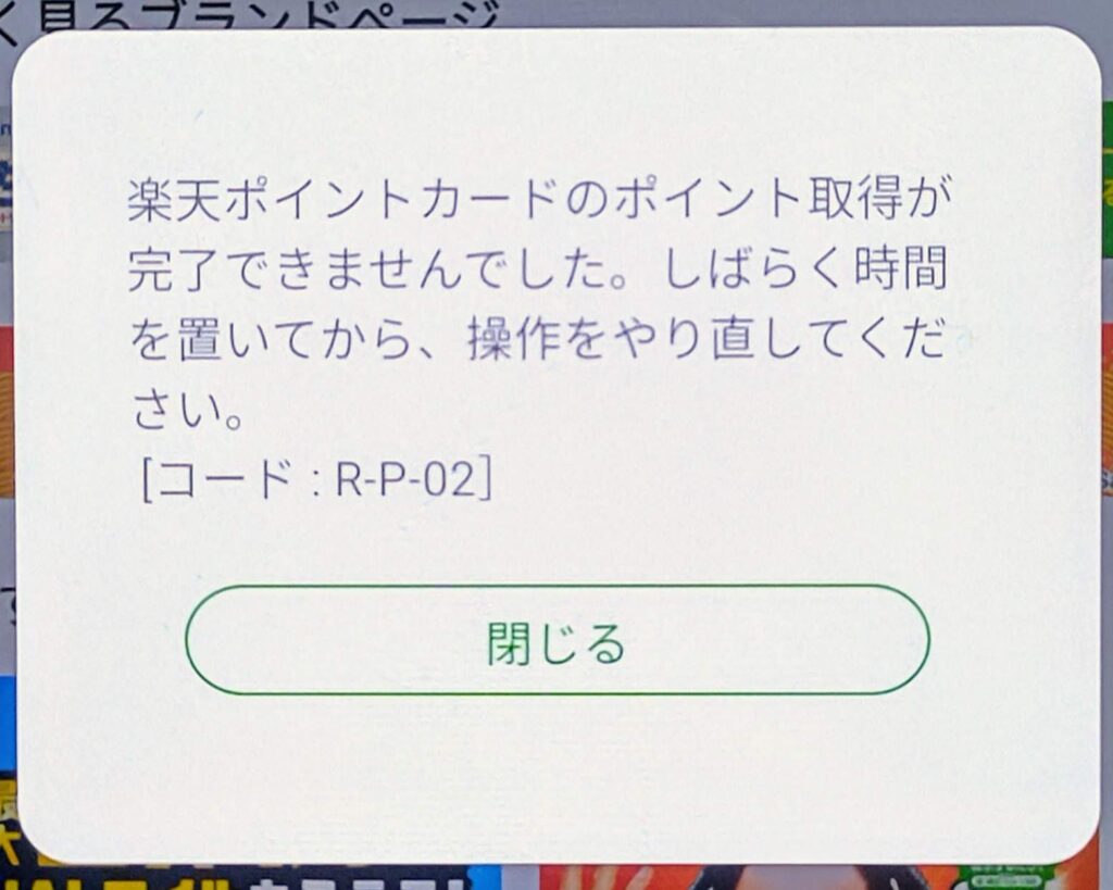 楽天ポイントカードのポイント取得が完了できませんでした。しばらく時間を置いてから、操作をやり直してください。
