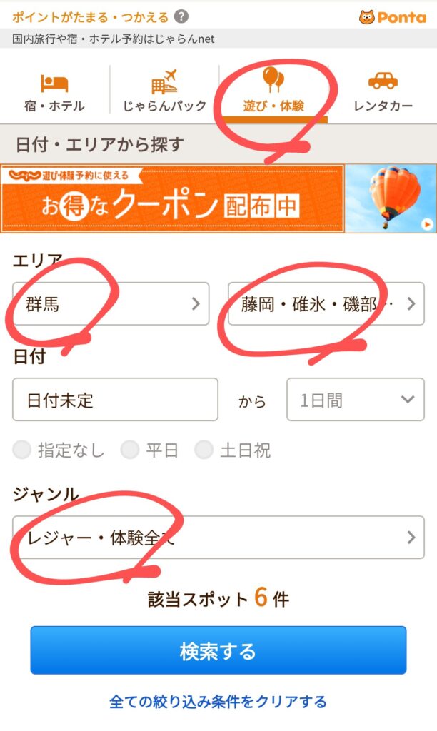 エリアを「群馬」「藤岡・碓氷・磯部・妙義」を選択