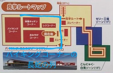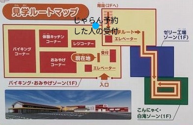 こんにゃくパークに着いたら、建物内へ入っていき上の画像の水色の●のところで受付をします。