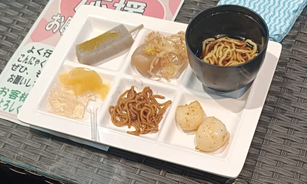 (上)味噌田楽・玉こん、しらたきの天ぷら・醬油ラーメン