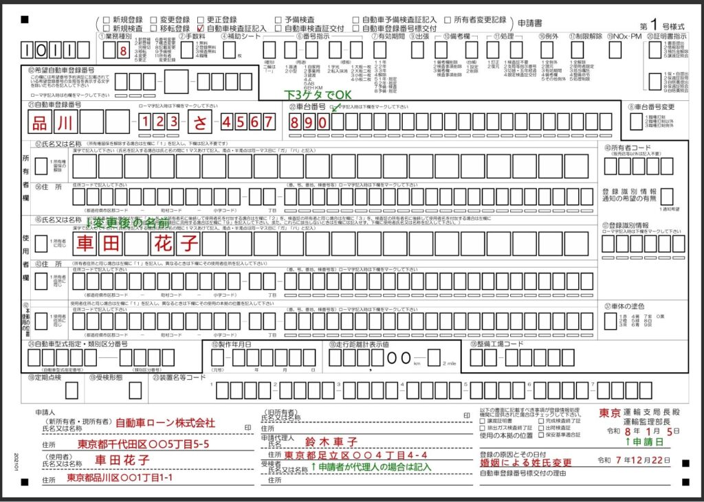 - 申請する車の車検証を見て、「自動車登録番号」と「車体番号」を記入
