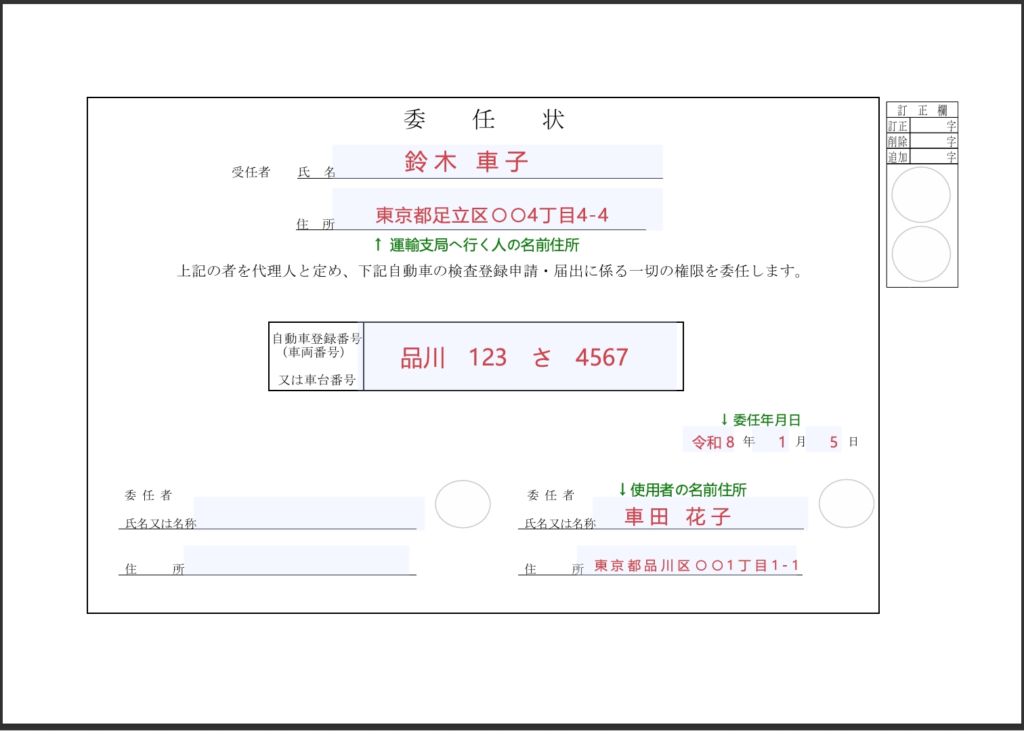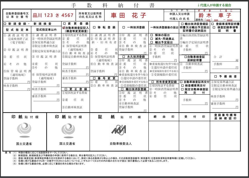┗ 委任状(普通車用)は国土交通省公式サイトのPDFからダウンロードできます - 変更登録申請書(OCRシート1号様式、運輸支局で配布)