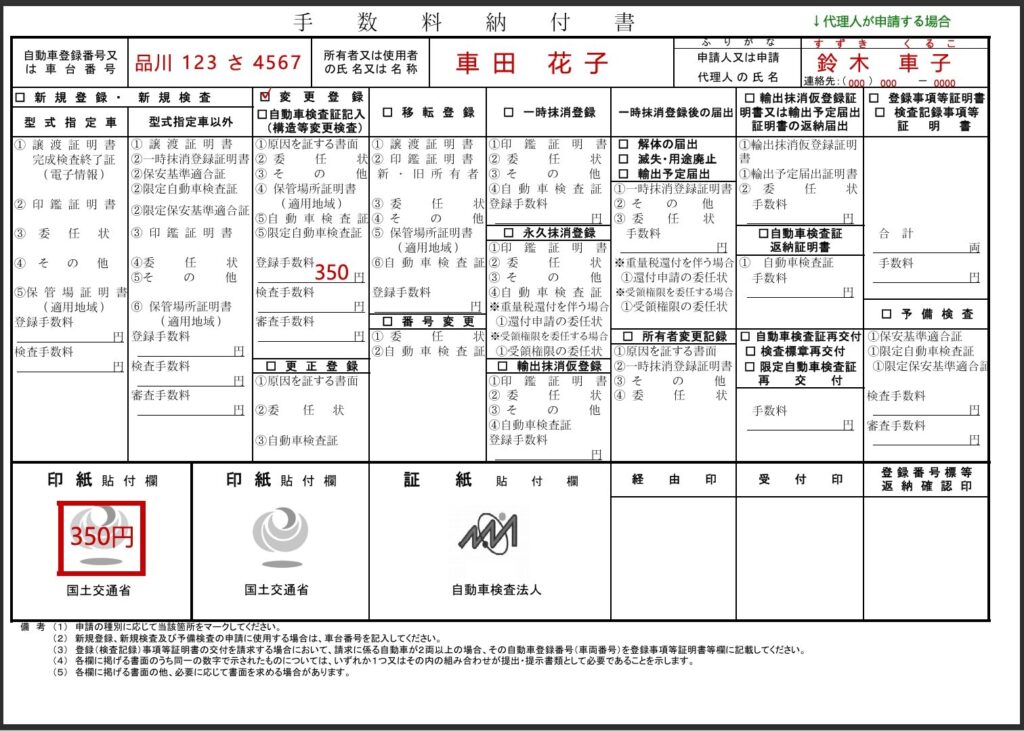 - 自動車検査登録印紙は運輸支局内の販売店で350円分を購入し、左下の貼付欄に貼ってください。