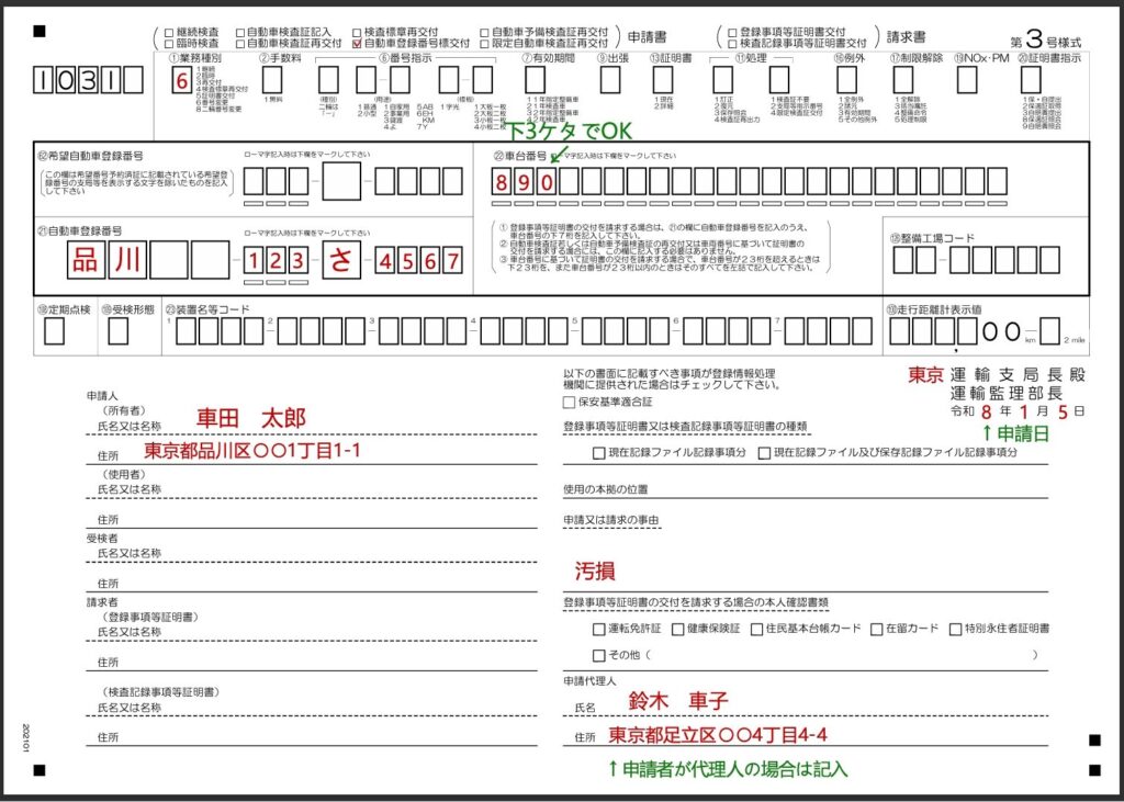 - 番号変更申請書(OCRシート3号様式、運輸支局で配布)