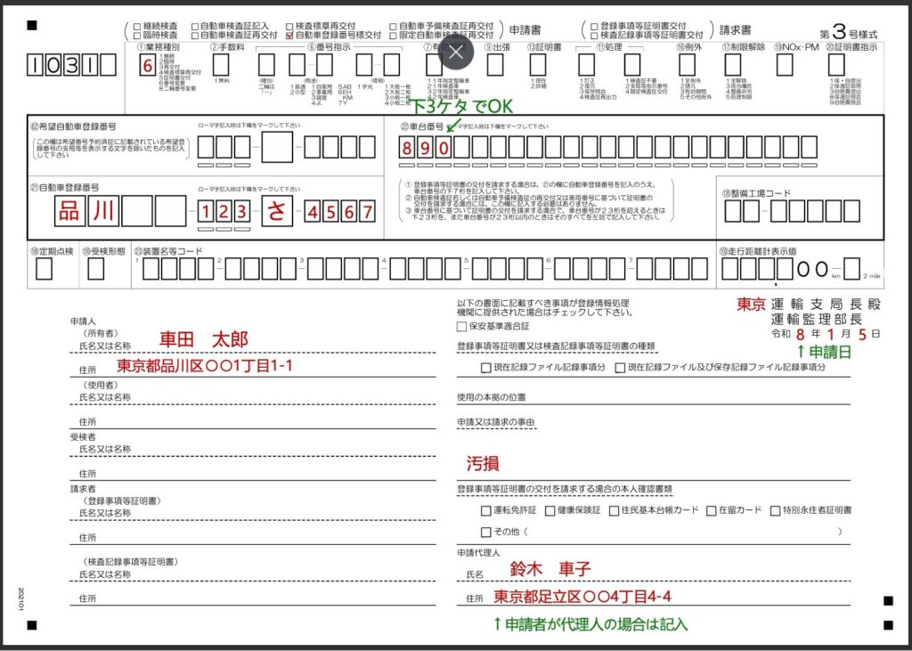 - 申請する車の変更前のナンバーを「自動車登録番号」に記入