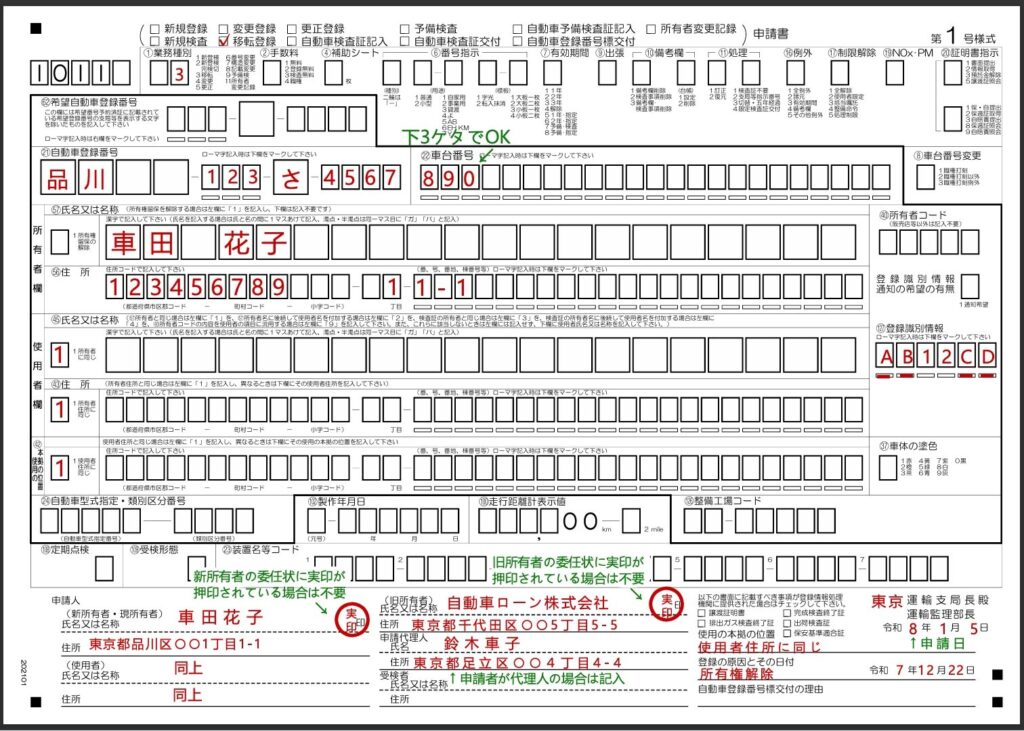 • 申請書を持っていく運輸支局名と申請日を記入