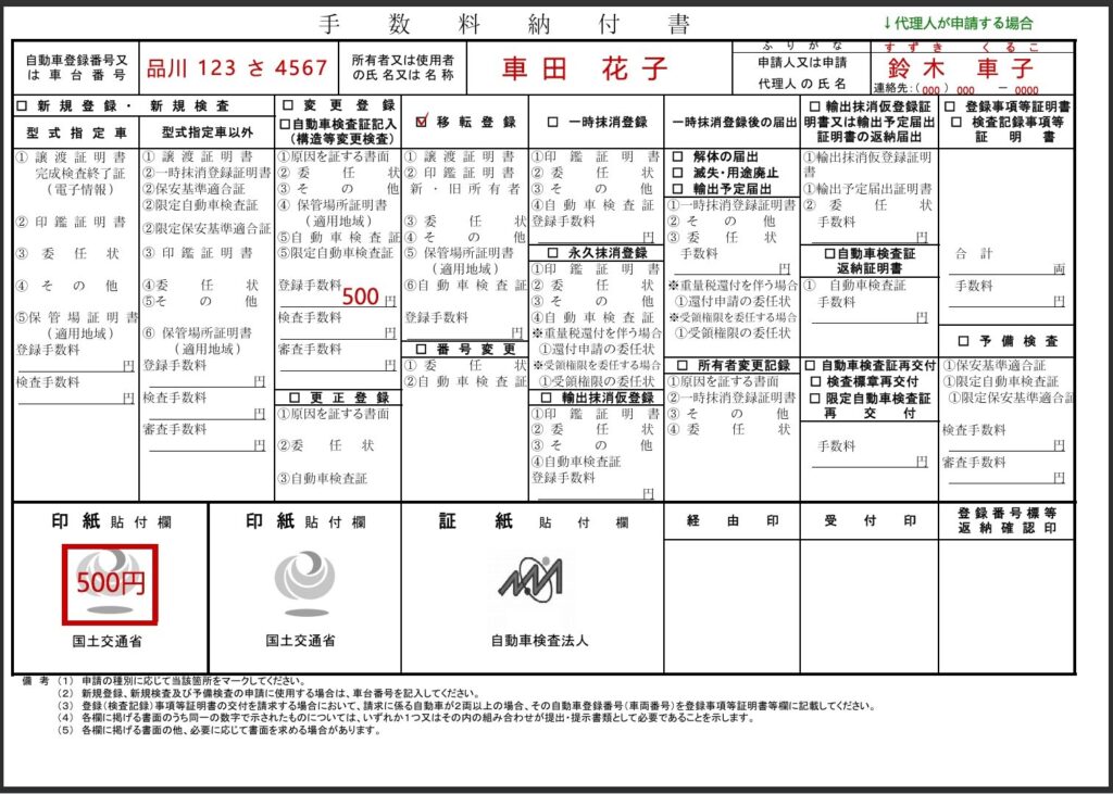 • 自動車検査登録印紙は運輸支局内の販売所で500円分を購入し、左下の貼付欄に貼ってください。