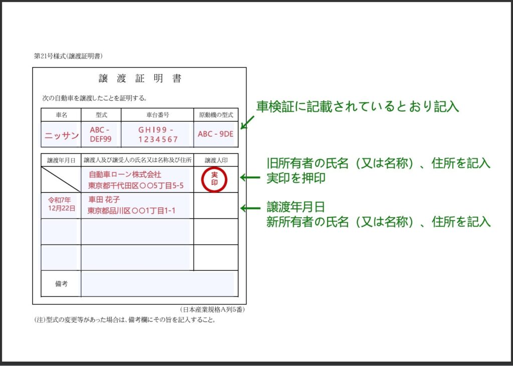 譲渡証明書記入例